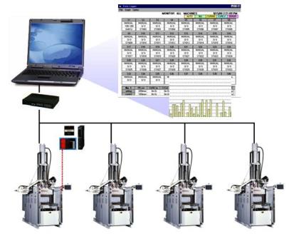 Communication device attached to PLC on press connects to central computer via hub using standard ethernet cable. Application software on PC can interact with each press individually to upload and download data. |